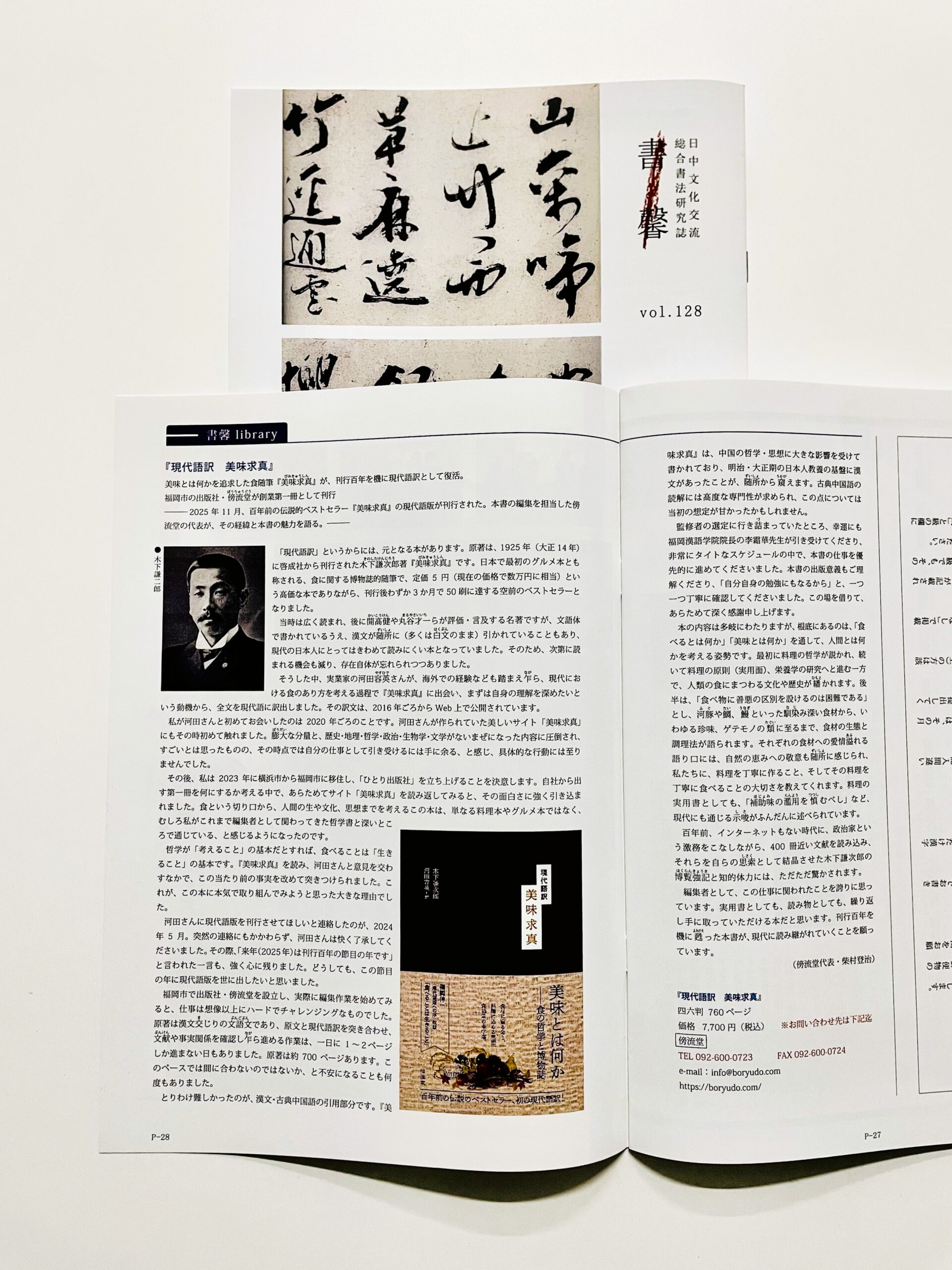 本日発売の書道月刊誌『書馨』2026年2月号「書馨library」コーナーにて、『現代語訳 美味求真』をご紹介いただきました。