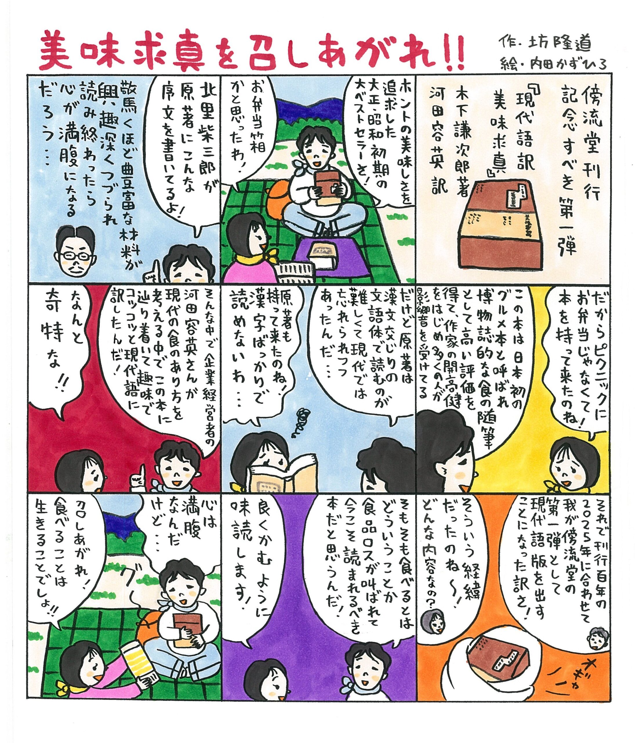 2025.12.01 『現代語訳 美味求真』紹介マンガができました! 傍流堂の創業第一冊となる『現代語訳 美味求真』の紹介マンガを、 漫画家・内田かずひろさんに制作していただきました。 タイトルは 「美味求真を召しあがれ!!」。 内田さんからは以前より 「傍流堂の1冊目が出たら、紹介マンガを描きますよ」 とお声がけいただいており、このたび本の魅力と“美味しさ”がぎゅっと詰まった作品として完成しました。 ぜひご覧ください。 本の詳細はこちらから。 Post Share Hatena Pocket RSS feedly Pin it Premium Japanにて『現代語訳 美味求真』が紹介されました